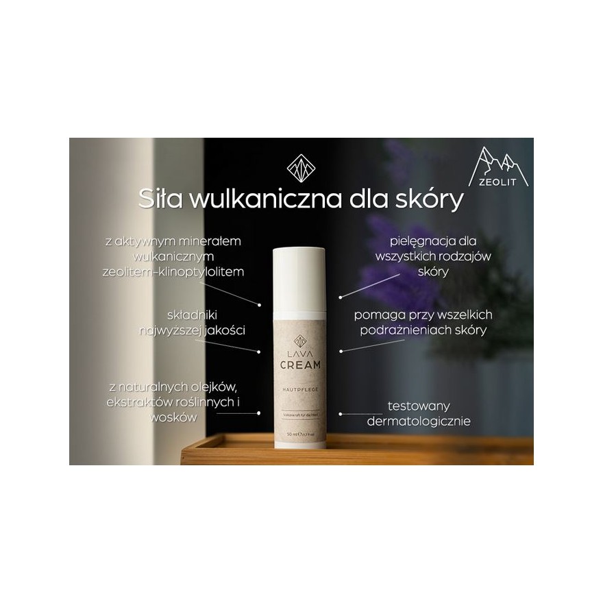 Ten najwyższej jakości krem budzi witalność skóry za pomocą wysokiej jakości naturalnych ekstraktów, naturalnych olejków, a przede wszystkim wulkanicznego minerału zeolitu-klinoptylolitu. Lava Cream służy do przyspieszonej regeneracji i intensywnej pielęgnacji wszelkich podrażnień skóry.