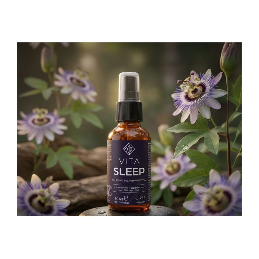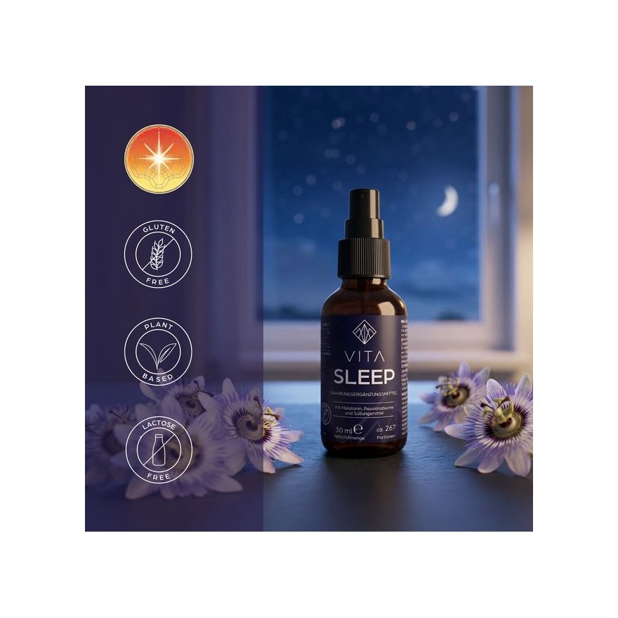 Spray VITA SLEEP został opracowany dla osób, które chcą CELOWO SKRÓCIĆ CZAS ZASYPIANIA lub szukają wsparcia podczas podróży ze zmianą stref czasowych. Połączenie melatoniny i ekstraktu z męczennicy uzupełnia wieczorną rutynę w praktyczny i wygodny sposób.